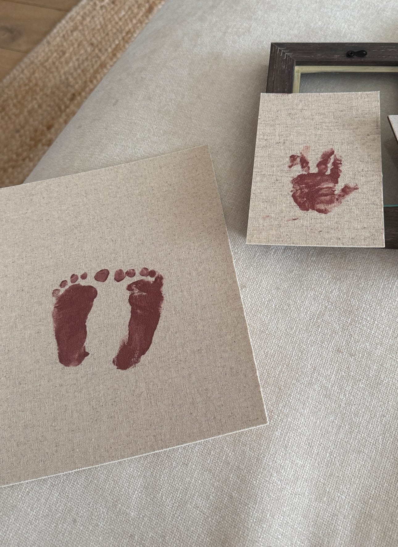 8. I saw the sweetest baby craft idea on Instagram and decided to try recreating it. I lucked out and found the exact linen paper at a little art shop downtown. They didn’t have any for sale, but the man working there cut me a piece from a frame backing they had. I had high hopes that my “art piece” would turn out just like the inspo… which was naïve of me, because it turns out getting a two-month-old to keep their feet still is actually really hard. Wes’ foot slid around a bit as we made a pitiful attempt at getting his footprint on the paper. That said, I still absolutely love the idea and plan to try again. If anyone has tips for how to do this more successfully, please share 🙃