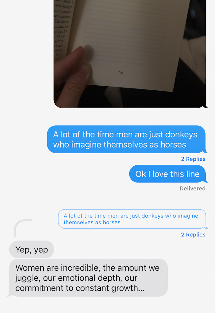 “A lot of the time men are just donkeys who imagine themselves as horses” — this line made me chuckle a lot when I came across it in my book the other night. I had to text it to a friend, who responded so perfectly. Women are such forces of nature.