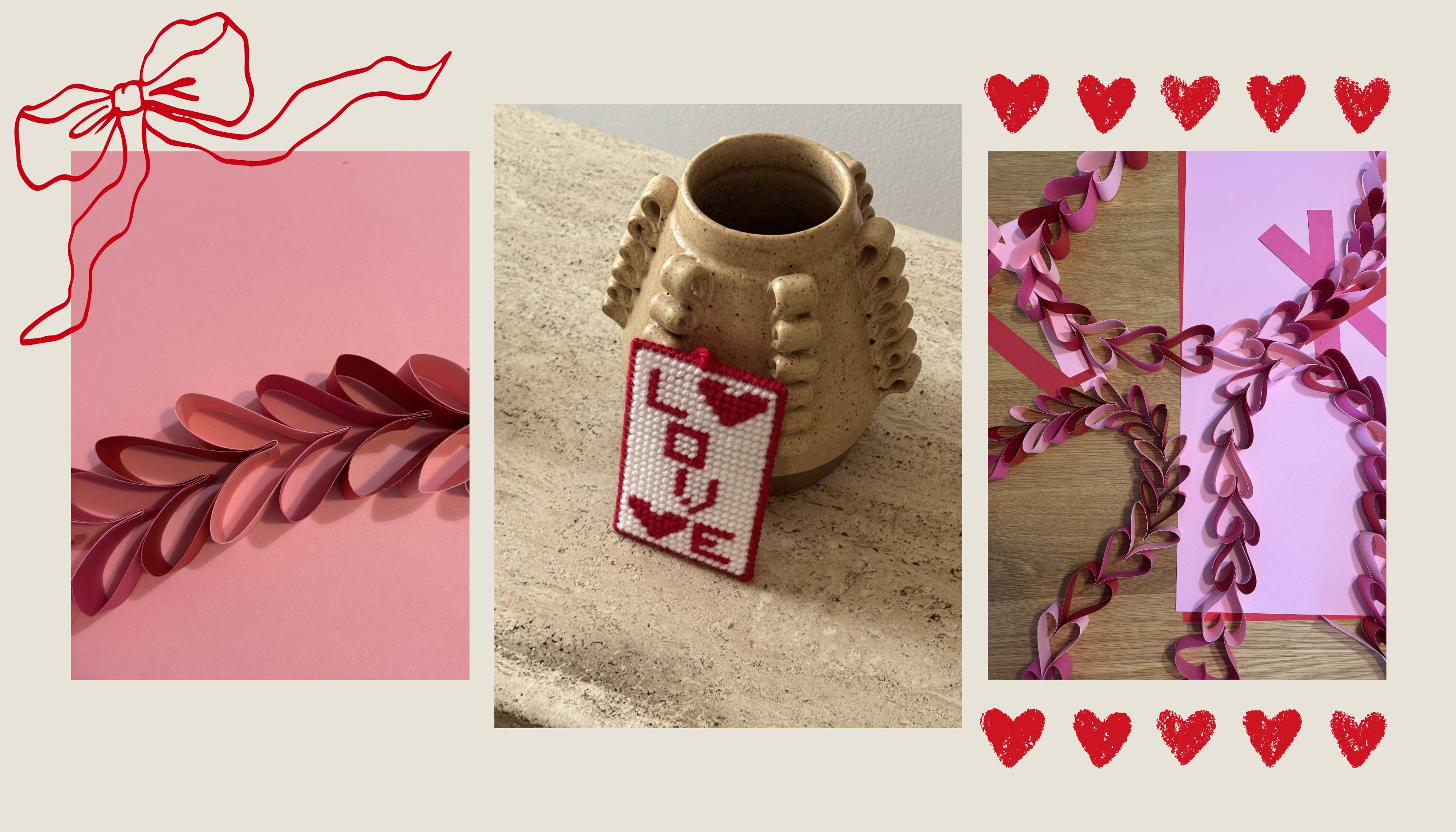 I went over to my friend’s house on her due date and we made the simplest little Valentine’s craft to distract her from the impending, forever life-changing event that could happen at any moment. We cut strips of pink and red construction paper, stapled them into heart shapes, and linked them together into a long chain. It was the kind of craft you’d make in elementary school, but that was part of the charm. I draped it across the fireplace mantle when I got home, and it instantly brought a smile on my face. I actually left it hanging all month for this reason. The following day, a lady stopped me on my walk with Wes and asked if I celebrated Valentines day. When I nodded, she reached into her bag and handed me a small crocheted piece that simply says “Love.” So sweet. It felt like the universe was really leaning into the theme.