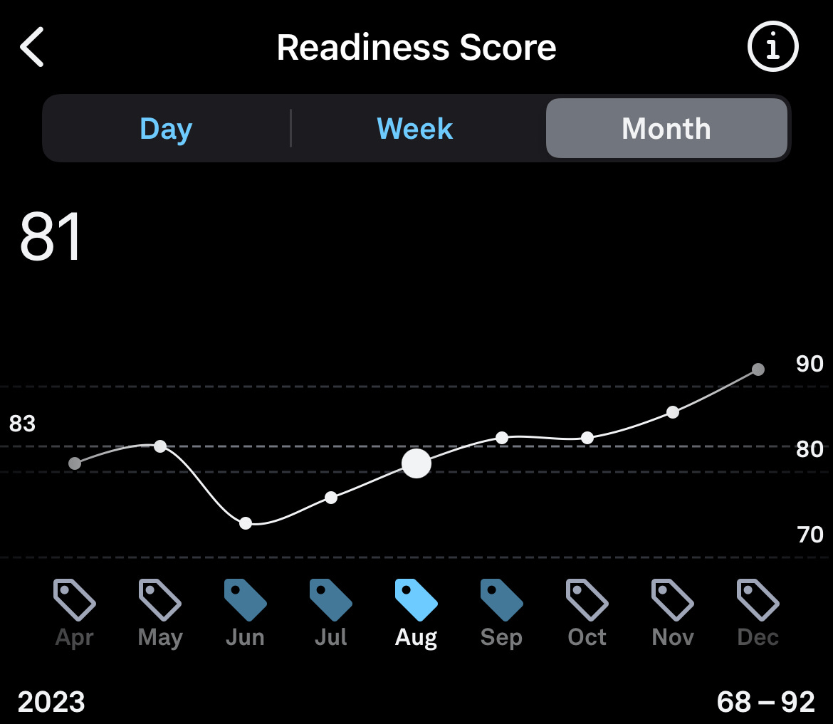 My Readiness Score is ultimately what I really like to pay attention to. It helps me understand not only how ready I am for the day but also the days ahead. It’s the most personalized score, taking into account my sleep patterns, my recent activity, and my body's stress signals (like temperature and heart rate variability). It provides a holistic picture of my health at that moment, and helps me identify if my body needs rest, or if I can go for it and push things a bit that day, because I’m well and rested.